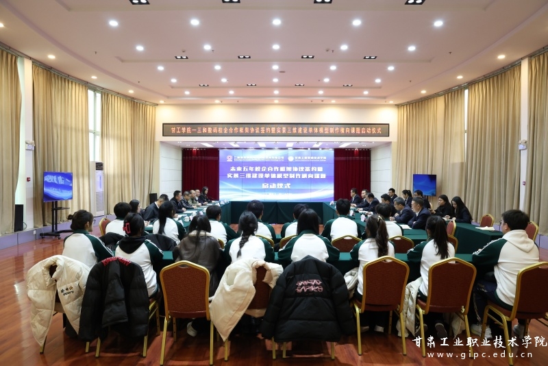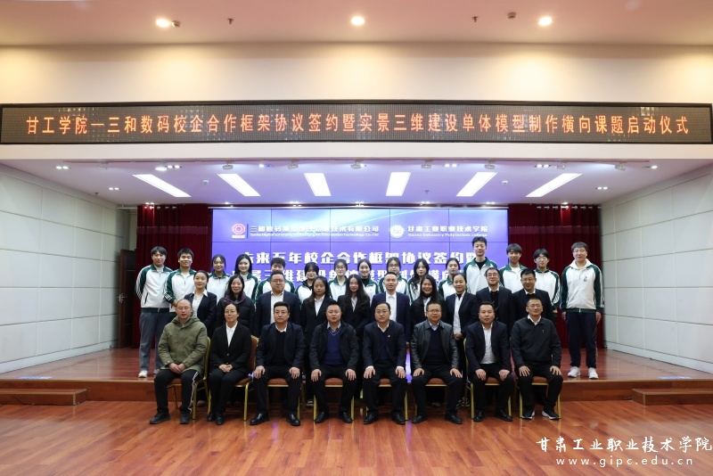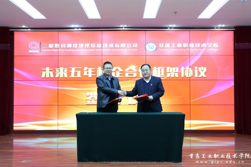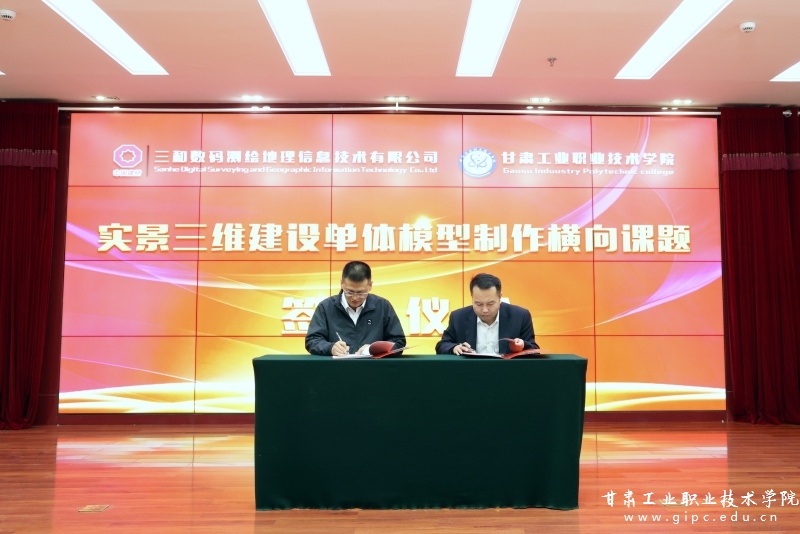 王利军和陈冠臣分别代表甘肃工业职业技术公司和三和数码签订了“未来五年校企合作框架协议”。刘安伟和武燕强代表双方进行了“实景三维建设单体模型制作横向课题”的签约。