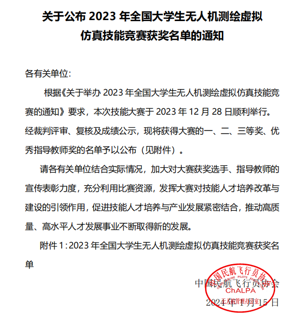 2023 年全国老员工无人机测绘虚拟仿真技能竞赛决赛于2023年12月28日早上9点开赛,伟德体育摄影2231班的陈豪和张永荣两位同学经过3个小时个人比赛,于2024年1月15日公布的获奖名单中,两位同学获得了两个三等奖的好成绩,通过此次比赛一方面锻炼了员工的能力,提升了专业知识,使得他们认识到了与其他员工的差距,一方面使他们对无人机摄影测量数据的获取和处理有了更深刻的认识。
