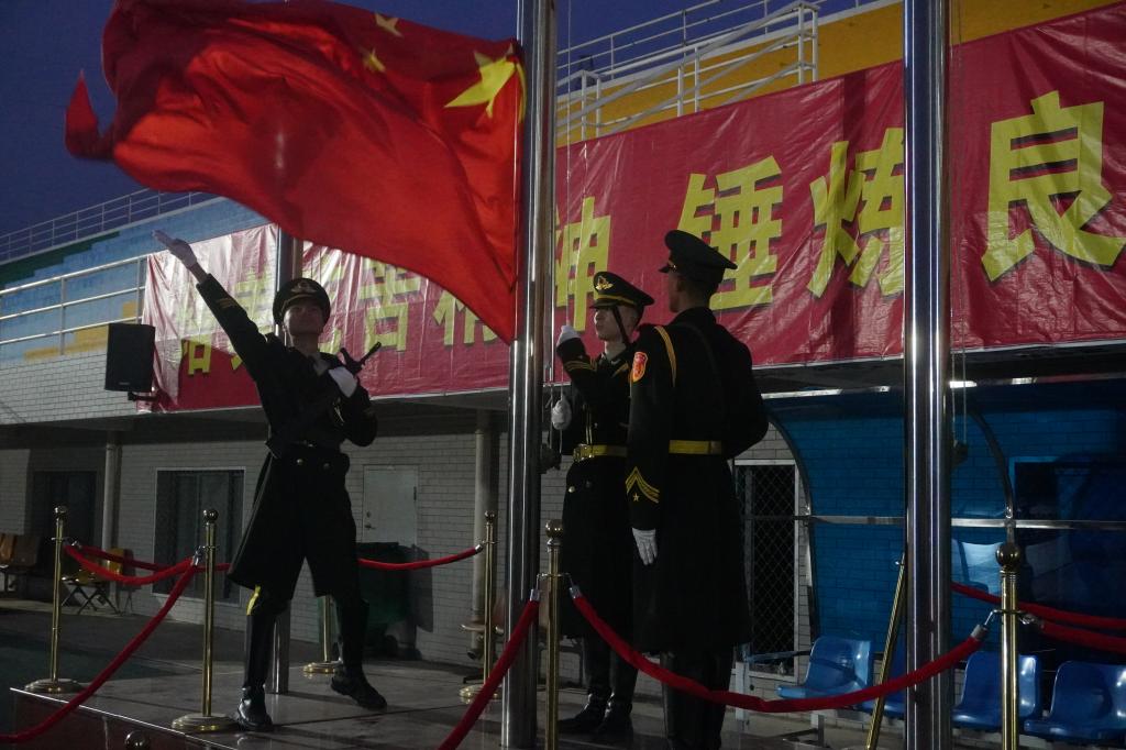 清晨六点四十分,升旗仪式正式开始。国旗护卫队队员迈着铿锵有力的步伐护卫国旗入场。全场师生肃立注目,旗手振臂一挥,伴随威武雄壮的《义勇军进行曲》,鲜艳的五星红旗冉冉升起,在熠熠晨光中迎风飘扬。