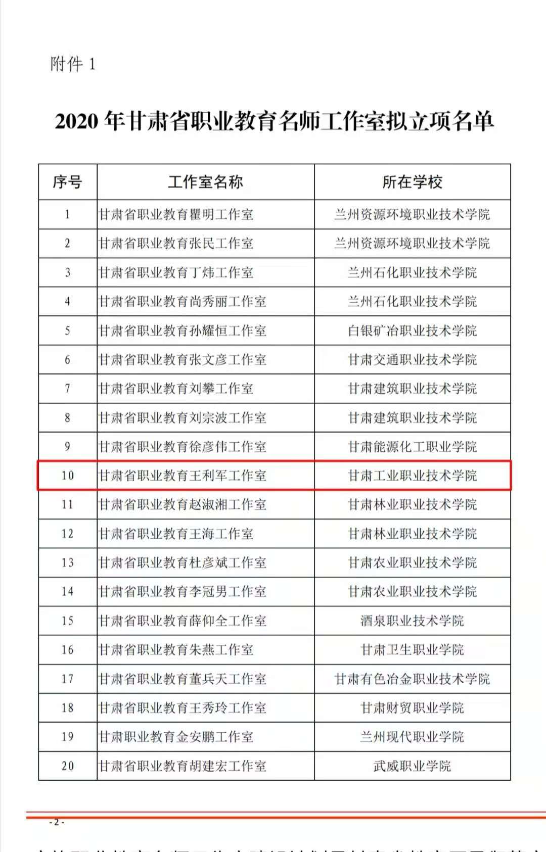 近日,甘肃省教育厅印发了《关于公布 2020年甘肃省职业教育名师工作室立项建设名单的通知》,2020年共遴选确定30个甘肃省“职业教育名师工作室”,经专家评审、名单公示等环节,伟德体育经理王利军主持的“甘肃省职业教育王利军工作室”成功获批立项建设,这是公司加强专业内涵建设中取得的又一项标志性成果。