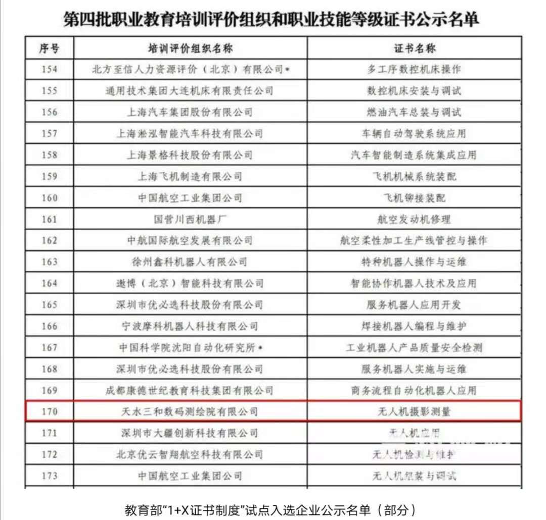 近日,天水三和数码测绘院有限公司申报的“无人机摄影测量职业技能等级证书”成功入选教育部职业技能等级证书名单,获得此技能等级证书的培训发证资格,这是是甘肃省首个成功申报的“1+X”证书。