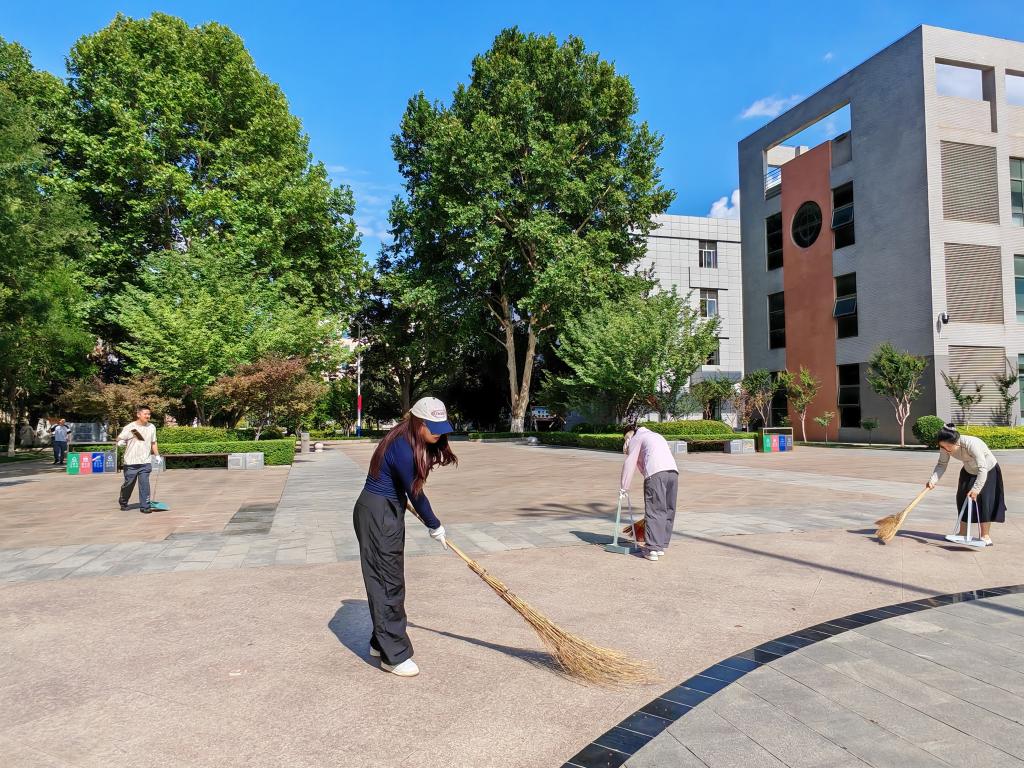 活动中,师生们分组行动,重点开展了环境卫生维护、过期标语更新、校园创意美化、墙面低处粘贴痕迹清理及绿化养护等工作。大家手持清洁工具,认真清扫路面落叶、擦拭宣传栏,并对绿化带内的杂草和垃圾进行了彻底清理。通过细致的工作,校园环境焕然一新,进一步提升了校园的整体形象。
