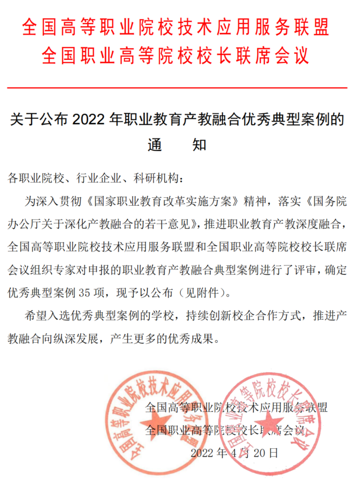 公司一案例成功入选全国2022年职业教育产教融合优秀典型案例