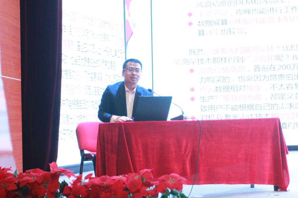 孙波中部长做了题为《无人机摄影测量数据处理及典型应用》的讲座,他用从数据处理,典型应用两方面对无人机测量数据的处理进行了专业而详尽的讲解,对无人机摄影测量目前的发展情况进行了介绍,同时他勉励测绘学子不辱青春,珍惜时光,努力学好专业知识;结合实际制定明确阶段目标;在各种环境中磨练个人坚定的意志,日后成为祖国的栋梁之才。潘清元主任从激光点云数据的定义,点云数据的用途及在实际生产中的建模应用等方面进行了介绍,生动而风趣的讲解赢得了在场师生的阵阵掌声。