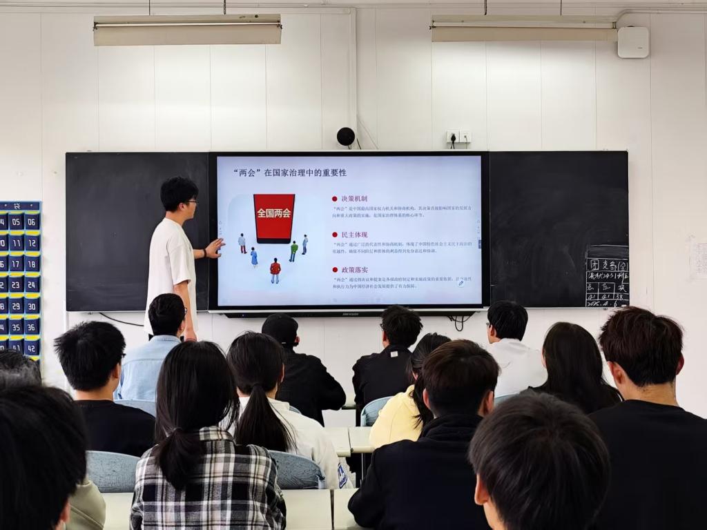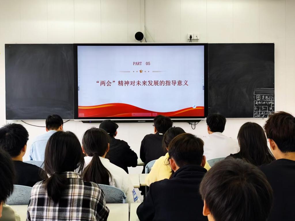团课过程中,团总支副书记赵云飞引领同学们通过观看两会精彩瞬间剪辑视频、聆听两会热点深度剖析来领悟两会精神。团总支副书记强调,同学们身为新时代的老员工,要保持对国内外时事的高度关注,全面了解国家在经济发展、科技创新、民生改善、生态保护等领域的显著成果。并鼓励大家勤奋学习专业知识,勇于创新实践,坚定不移地拥护党的领导,将个人的理想追求融入到国家发展的宏伟蓝图之中,在奉献中实现人生价值,让青春在为祖国繁荣富强的奋斗中闪耀光芒。